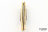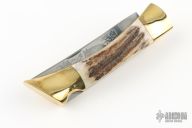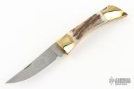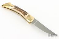 The Wildlife Series was manufactured by Boker. This one has an upswept mirror polished blade with an image of a wild hog. The handle has a brass frame with dovetailed bolsters, stag scales, stainless steel backspacer. Excellent condition. Comes with original box and papers.