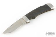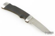 This Cheetah by Katz Knives features a satin finished drop point blade with nail nick and notched thumbrest. The handle has stainless steel boslters, front and rear, rubber scales, brass liners. Comes with brown leather belt sheath and original box. Excellent condition. Blade Steel: XT80 Stainless Steel