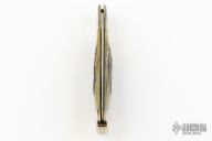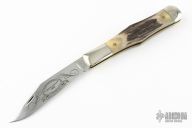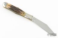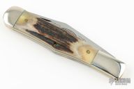This Ka-Bar slipjoint is dated 1981. It has a mirror polished blade with nail nick. The handle has nickel silver bolsters, stag scales, brass liners, and stainless steel spring. Has some light scratches, otherwise excellent condition. #0443. Comes with original box and order form.