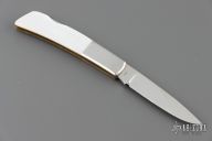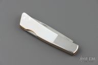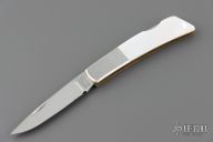 This Silver Knight by Gerber features a mirror polished blade with nail nick. The handle has stainless steel bolsters, mother of pearl scales, stainless steel liners, and a stainless steel backspacer. Excellent condition. Comes with original box and slip sheath