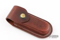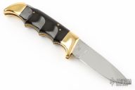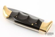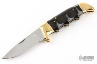 This Folding Field Model 1050 by Kershaw features a mirror polished drop point blade with notched thumbrest and nail nick. The handle has brass bolsters and liners, black scales. Excellent condition. Nice lockup and blade seating. Comes with original box, papers and brown leather sheath.
