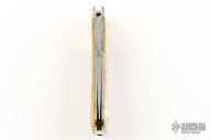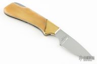 This vintage lockback by Kershaw features a mirror polished blade with nail nick. The handle has brass bolsters and stainless steel liners. The scales are bone with scrimshaw dated 1982 and #1137. Has two small dings in the blade edge, otherwise excellent condition.