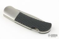 This Lockback by Gerber has a satin finished blade with nail nick. The handle has stainless steel bolsters, checkered rubber scales, stainless steel liners and backspacer. Comes with original box. Excellent condition.