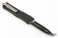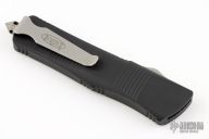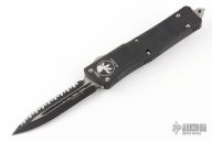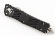 This Troodon by Microtech features a black blade with one fully serrated edge. The handle has a black aluminum frame with blasted hardware and tip down clip. Dated 01/2011 s/n 08587. Excellent condition. Comes with original box and papers.