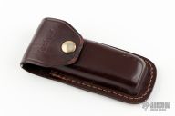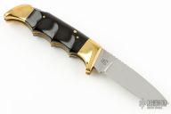 This Folding Field Model 1050 by Kershaw features a mirror polished drop point blade with notched thumbrest and nail nick. The handle has brass bolsters and liners, black scales. Excellent condition. Nice lockup and blade seating. Comes with original box, papers and brown leather sheath.