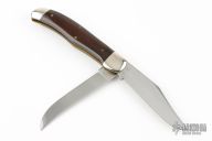 This two-blade trapper by Ka-Bar features two mirror polished blades with nail nicks. The handle has nickel silver bolsters, rosewood scales with brass liners and stainless steel springs. Comes with original box. Excellent condition.