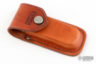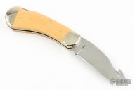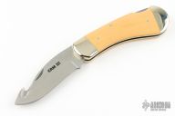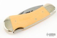 This lockback by CAMIII features a satin finished gut hook blade with nail nick. The handle has nickel silver bolsters, yellow paper micarta scales, nickel silver liners, stainless steel backspacer. Comes with a brown leather sheath, original box, patch and pin. Has a couple light scratches, otherwise excellent condition.