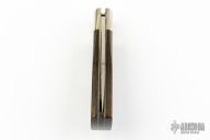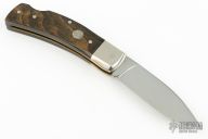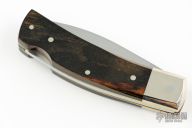 This vintage lockback folder by Smith and Wesson features mirror finished blade. The handle has nickel silver bolsters, wood scales, brass liners, stainless steel backspacer. Excellent condition. Comes with original box, papers and black leather sheath.