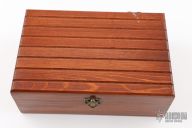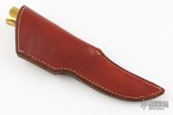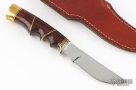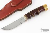 This knife by Jerry McJilton features a mirror polished blade with .202" blade stock and .903" blade depth, hidden tang construction. The handle has a nickel silver guard, brass butt, cocobolo grip with brass spacers. Comes with a brown leather sheath and wooden presentation box. Excellent condition.