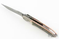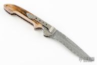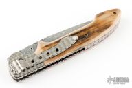 This Perfigo folder from Crawford Knives features a Hakka Pella Pattern Damasteel blade with a single thumbstud with a Swarovski Sapphire set in a gold bezel, and false top edge and fileworked spine. The handle has dovetailed and jeweled titanium bolsters, mammoth ivory scales with red liners, fileworked titanium liners with jeweled interiors, fileworked titanium backspacer, and a tip down fileworked stainless steel clip. Nice detent, blade seating and lockup. Comes with padded zippered case. New from maker!