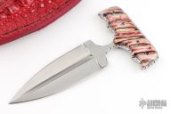 This Blood Tooth Push Dagger by Crawford Knives features a hand rub satin finished double edged blade with fullers and fileworked tang, .211" blade stock and 1.704" blade depth, full tang construction. The handle has mammoth tooth scales with red liners. Comes with a red leather sheath with red alligator skin overlay and metal clip. Comes with a zippered case. New from maker!