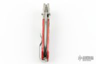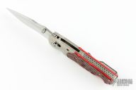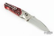 "Combining technical excellence with a spirited new design, the Arcitech has that trait that is so elusive... harmony. A mirror polished san mai (VG-10 core laminated with 420J2 stainless steel) exotic blade moves smooth as silk and mechanically effortless thanks to our very special Arc-Lock and Abalone jeweled thumb stud. The titanium bolsters meet old school jigged bone handles in a rare and beautiful combination. The color of the jigged bone handles vary in color from a deep maroon to flame yellow and black making each knife a unique piece. Investment collectable and very limited production." Comes with a black box. Excellent condition.