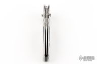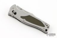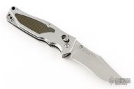This SR-02 Stingray Axis Lock Folder has a satin finished VG-10 San Mai blade with notched thumbrest and single thumb stud. Handle is satin finished stainless steel with carbon fiber inlays, stainless steel liners, black fiber back spacer, and lanyard hole. Excellent condition. Comes with original box and papers.