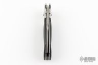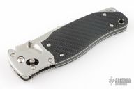 This SOG TomCat Axis Lock Folder has a VG-10 blade with dual thumb studs and a notched thumbrest. Handle is black rubber with satin finished stainless steel bolsters over stainless steel frame with notched thumb rest and black fiber back spacer. Has lanyard tube pin. Comes with SOG nylon velco sheath, original box and papers. Excellent condition. Still has plastic covers on the bolsters.
