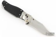 This SOG TomCat Axis Lock Folder has a VG-10 blade with dual thumb studs and a notched thumbrest. Handle is black rubber with satin finished stainless steel bolsters over stainless steel frame with notched thumb rest and black fiber back spacer. Has lanyard tube pin. Comes with SOG nylon velco sheath, original box and papers. Excellent condition. Still has plastic covers on the bolsters.
