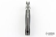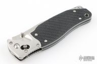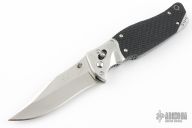 This SOG TomCat Axis Lock Folder has a VG-10 blade with dual thumb studs and a notched thumbrest. Handle is black rubber with satin finished stainless steel bolsters over stainless steel frame with notched thumb rest and black fiber back spacer. Has lanyard tube pin. Comes with SOG nylon velco sheath, original box and papers. Excellent condition. Still has plastic covers on the bolsters.
