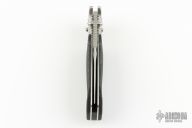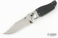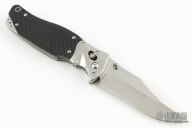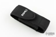 This SOG TomCat Axis Lock Folder has a VG-10 blade with dual thumb studs and a notched thumbrest. Handle is black rubber with satin finished stainless steel bolsters over stainless steel frame with notched thumb rest and black fiber back spacer. Has lanyard tube pin. Comes with SOG nylon velco sheath, original box and papers. Excellent condition. Still has plastic covers on the bolsters.