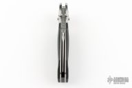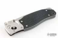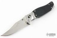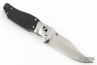 This SOG TomCat Axis Lock Folder has a VG-10 blade with dual thumb studs and a notched thumbrest. Handle is black rubber with satin finished stainless steel bolsters over stainless steel frame with notched thumb rest and black fiber back spacer. Has lanyard tube pin. Comes with SOG nylon velco sheath, original box and papers. Excellent condition. Still has plastic covers on the bolsters.