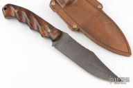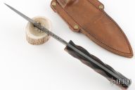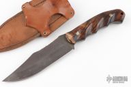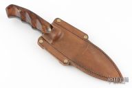 This Crow Scout by Half Face Blades features a dark stonewashed blade with notched thumb ramp, .176" blade stock, 1.382" blade depth, full tang construction.  The handle has sculpted wood scales.  Comes with a brown leather sheath.  Excellent Condition.