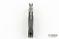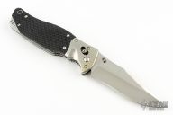 This SOG TomCat Axis Lock Folder has a VG-10 blade with dual thumb studs and a notched thumbrest. Handle is black rubber with satin finished stainless steel bolsters over stainless steel frame with notched thumb rest and black fiber back spacer. Has lanyard tube pin. Comes with SOG nylon velco sheath, original box and papers. Excellent condition. Still has plastic covers on the bolsters.
