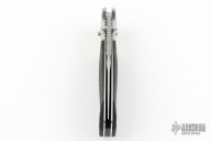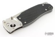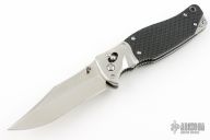 This SOG TomCat Axis Lock Folder has a VG-10 blade with dual thumb studs and a notched thumbrest. Handle is black rubber with satin finished stainless steel bolsters over stainless steel frame with notched thumb rest and black fiber back spacer. Has lanyard tube pin. Comes with SOG nylon velco sheath, original box and papers. Excellent condition. Still has plastic covers on the bolsters.