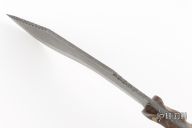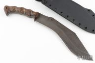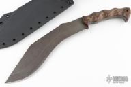This large Kukri features a large recurved blade with a file worked blade spine with a full tang construction.  .209" Blade Stock.  2.281" Blade Depth.  The handle has curly mango wood scales with mosaic pins.  Includes a kydex sheath.  Excellent Condition.