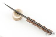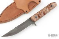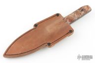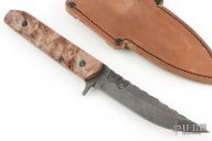 This Kwaiken by Half Face Blades features a dark tumble finish blade with a textured spine, .156" blade stock, .925" blade depth, full tang construction.  The handle has sculpted maple scales over black liners.  Includes a brown leather sheath.  Excellent Condition.
