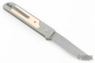 This side-opening automatic by Dalton features a bead blast blade with a partially serrated edge and an aluminum frame with ivory micarta inserts on both sides. Bead blast titanium clip. Strong coil spring opening. Excellent condition.