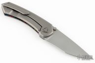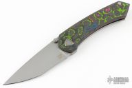This Shiru by Edison Barajas features a bead blasted blade with notched thumbrest and dual thumbstuds, can be front flipped. The handle has a 80's Camo carbon fiber and blasted titanium frame with matching backspacer and tip up clip. Has custom pivot. Rides on bearings, nice detent, lockup and blade seating. Comes with original box and COA.  New from maker!