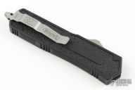 This Scarab OTF automatic by Microtech knives has a bead blast finished double edge partially serrated blade. The handle has a black aluminum frame with non-slip inlays, bead blasted stainless steel clip, bead blasted hardware and glass breaker. Dated 09/2012 and s/n 05500. Excellent condition. Comes with original sheath, and a Microtech box for a different Scarab (175-3T), and the papers.