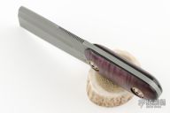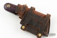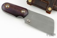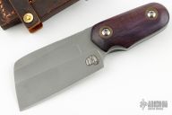 This cleaver features a bead blasted blade with a full tang construction.  .186" Blade Stock.  1.812" Blade Depth.  The handle dyed wood scales.  Includes a brown leather sheath.  Has some light spotting on the blade otherwise the knife is in excellent condition.
