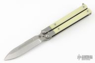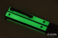 The SPD Invictus-Bali GID is a utility style, bi-handle folding knife, featuring titanium billet handles with integrated bolsters and Hyper-Glow GID scales with 3 fullers each, a Böhler M390 blade, new, updated bearing pivot, and a titanium spring latch. Additional details include 2-tone machine satin and bead blast blade finish, jimping on the ears and back spacers, and a billet titanium pocket clip. Specifications: