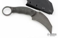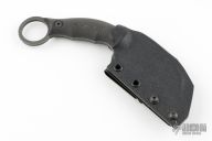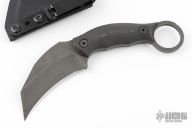 This Karambit by Half Face Blades features a dark tumble finished chisel ground hawkbill blade with textured spine, .150" blade stock and 1.456" blade depth, full tang construction. The handle has carbon fiber scales with a ring at the butt. Comes with kydex sheath with belt clip, original box and papers. Excellent condition.