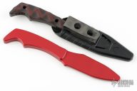 This Dynamis Revere fixed blade was crafted by Winkler Knives. It features a black spear point blade with sharpened and serrated top edge and notched thumbrest, .188" blade stock and 1.054" blade depth. The handle is comprised of sculpted black/red G-10 scales over full tang construction. Jimping on pommel provides purchase when holding in the reverse grip. Includes a molded plastic sheath with metal clip. Excellent condition. Comes with original box, red aluminum trainers and papers.