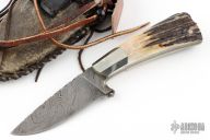 This knife by Master Smith Daniel Winkler features a Damascus drop point blade with a fileworked thumbrest and a tapered tang construction, .167" Blade Stock and .920" Blade Depth. The handle has nickel silver bolsters with stag scales.  Includes a raw hide covered leather sheath.  Excellent Condition.