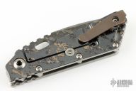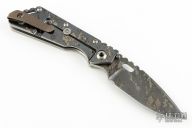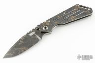 This Mick Strider Performance Series SMF framelock folder features a laser engraved spear point blade with thumbhole and notched thumbrest. The handle has a stonewashed and laser engraved titanium frame with titanium clip, tip up carry. Jimping on blade spine. Includes Hinderer "Lock Bar Stabilizer" for maximum reverse lock retention. Nice detent, lockup and blade seating. Excellent condition. Comes with a custom titanium deep carry clip and original clip.