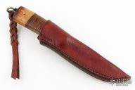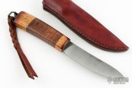 This knife by Paul Cooper features a drop point blade with a hidden tang construction. .176" Blade Stock. .983" Blade Depth. The handle has wood and stacked leather grip. Includes a brown leather sheath. Excellent Condition.