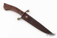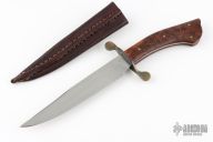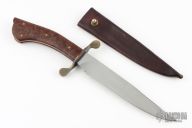 This Bowie by Paul Cooper features a hand rub satin finished blade with false top edge and a tapered tang construction.  .223" Blade Stock.  1.105" Blade Depth.  Includes a bronzed steel guard with wood scales and copper inlays. Includes a brown leather sheath.
