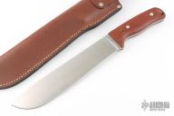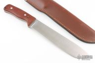 This 10" Bolo by Scott Gossman features a satin finished drop point blade with a full tang construction, .181" Blade Stock and 1.944" Blade Depth. The handle is composed of brown canvas micarta scales. Includes a brown leather sheath with belt loop. Excellent condition.