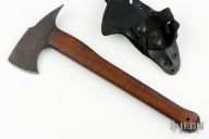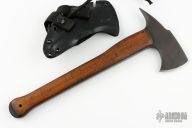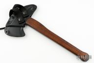 A combination tool developed for Military and Law Enforcement use, the WK Combat Axe is made for breaching and combat applications. The user has easy access with a fast draw carrier. An integral glass breaker extends beyond the end of the handle. The WK Hammer Combat Axe is basically the same axe as the WK Combat Axe, but with a hammer pole rather than a spike. It is a great woodcraft or field axe or performs well as a breaching axe when hammering is part of the operation. A partial cord wrapped upper handle option is available. If the handle is damaged under the head, a new cord can readily be installed. The cord is also an excellent emergency resource. Axe Specifications Axe steel: 80CrV2 Black oxide no-glare finish Head length: 5 7/8" Overall length: 13 3/4" Blade thickness: 3/8" Skeletonzied full tapered tang Integral Glass Breaker Partial cord wrap optional Sheath Fast draw carrier Lined Kydex® HD shockcord quick-release retention system Nylon belt straps with Mil-Spec Pull-The-Dot™ snaps Designed for multiple carry options. Has some scuffs, otherwise excellent condition. This knife has the "Transitional Stamp" right above the scale, I believe was used between the Winkler Knives II stamp, and the markings they are using now.