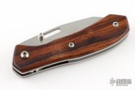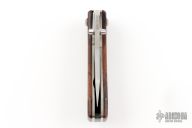 This linerlock by Pavlo Murnikov features a hand rub satin finished blade with thumbhole and dual thumbstuds. The handle has desert ironwood scales, VT6 titanium liners, carbon fiber backspacer. Comes with a brown leather sheath with an Ulti-Clip. Rides on washers, nice detent, lockup and blade seating. New from maker.