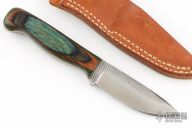 This file knife by Anza Knives features a blade made from a file, dymondwood scales, .190" blade thickness and 1.111" blade depth, full tang construction. Comes with a brown leather sheath. Dated '01 Excellent Condition.