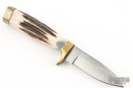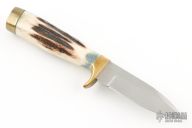 This hunter by Kershaw was made by Dan Harrison, it has a satin finished blade with false top edge, .185" blade stock, .892" blade depth, hidden tang construction. The handle has a brass guard and butt with a stag grip. Excellent condition.