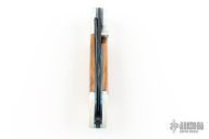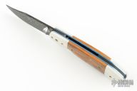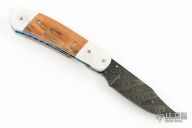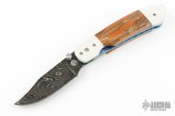 This knife by Jake Elenbaas features a clip point Alabama Damascus blade with single thumbstud with stone inlay. The handle has white G-10 bolsters, front and rear, mammoth ivory scales, anodized titanium liners with jeweled interiors and a black G-10 backspacer. Nice lockup and blade seating. Comes with COA. New from maker.