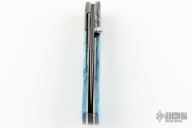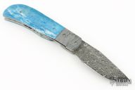 This knife by Jake Elenbaas features a drop point San-Mai Damascus blade with single thumbstud with stone inlay. The handle has Damascus bolsters, dyed giraffe bone scales, titanium liners with jeweled interiors and a black G-10 backspacer. Nice lockup and blade seating. Comes with COA. New from maker.