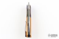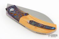 This linerlock front flipper by Stephane Sagric features a hand rub satin finish wharncliffe blade with swedge, notched thumbrest and front flipper. The handle has ZircuTi bolsters, natural linen micarta scales, titanium liners, ZircuTi backspacer and tip up clip. Rides on bearings, nice detent, lockup and blade seating. Comes with leather case. Excellent condition.