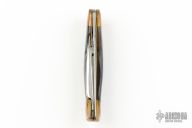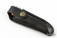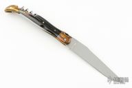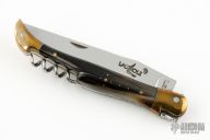 This Laguiole Knife has a satin finished 12C27 stainless steel clip point blade with nail nick and filed spine. Has a marlin spike and corkscrew. The handle has brass bolsters/liners, stainless backspacer and buffalo horn covers.  Backspring has filework.  Excellent Condition.  Comes with black leather sheath with sharpening steel.