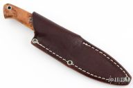 This Mini North Star from Bark River features a drop point satin finish blade with notched thumbrest, .122" blade stock and .835" blade depth, full tang construction. The handle has burl wood scales with mosaic pins. Includes original leather sheath. Excellent condition.