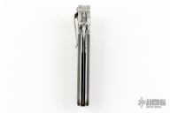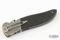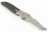 This Slayer Linerlock from Larry Chew features a satin finish clip point blade with false top edge, dual thumb studs and notched thumb ramp. The handle has dovetailed titanium bolsters, carbon fiber scales over titanium liners and black linen micarta backspacer. Titanium tip down clip. Nice detent, blade seating and lock up. Excellent condition.