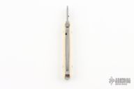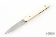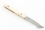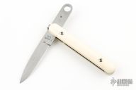 This knife by Francis Boyd features a mirror polished blade with thumbdisc. The handle has mammoth scales over stainless steel liners and backspacer. Includes a padded zippered case. Has some light scratches otherwise the knife is in excellent condition.